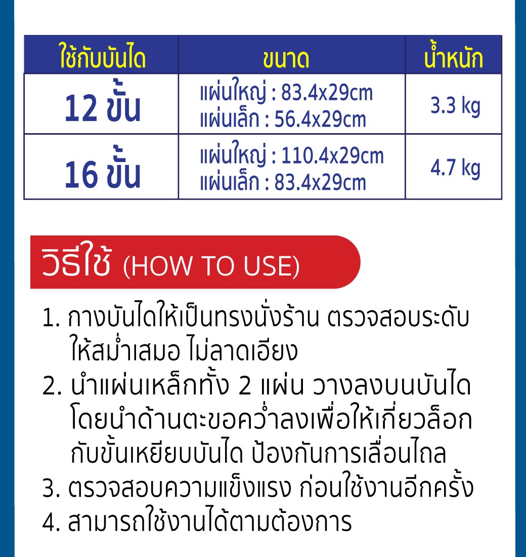 • นำแผ่นเหล็กทั้ง 2 แผ่น วางลงบนบันได โดยนำด้านตะขอคว่ำลงเพื่อให้เกี่ยวล็อกกับขั้นเหยียบบันได ป้องกันการเลื่อนไถล