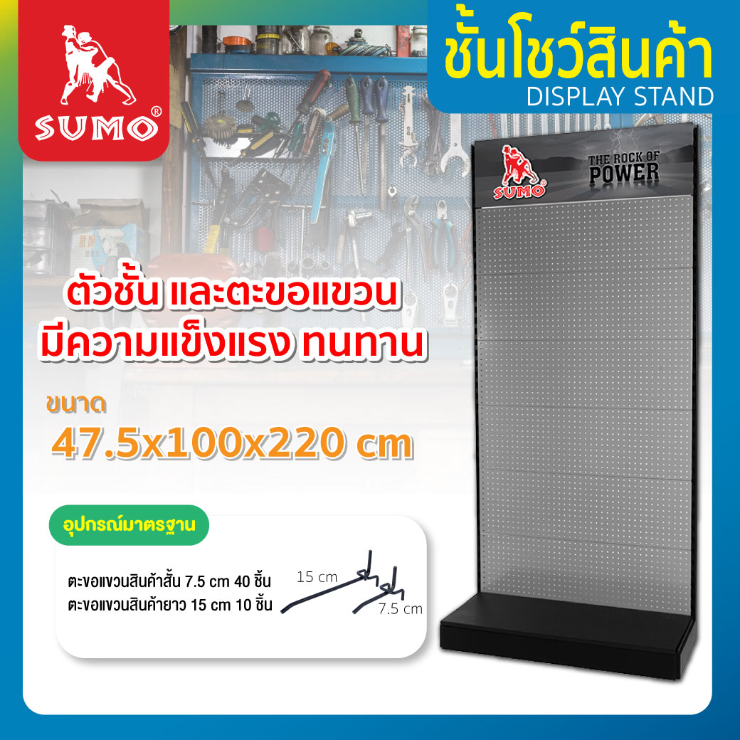 ชั้นโชว์เครื่องมือ 47.5x100x220cm ชั้นโชว์สินค้าแบบด้านเดียว วางสินค้าได้ตามที่ต้องการ เพียงนำตะขอแขวนสินค้า เสียบใส่ชั้นโชว์