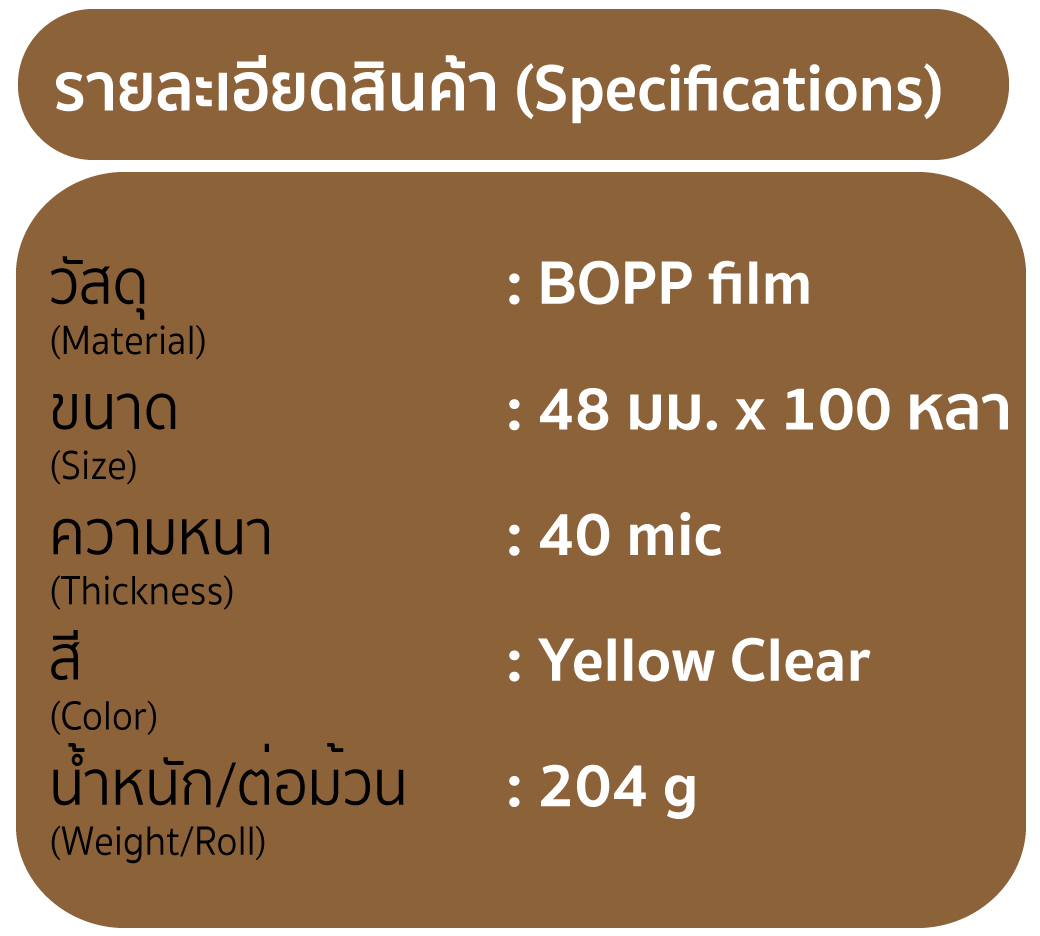 • เนื้อเทปผลิตจากฟิล์มคุณภาพดี ไม่หลุดลอกความยาว 100 หลาเต็ม ไม่มีฟองอากาศ