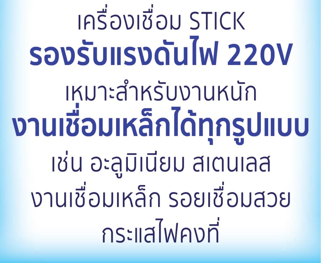 เครื่องเชื่อม STICK รองรับแรงดันไฟ 220V สำหรับงานหนัก เชื่อมเหล็กได้ทุกรุปแบบ เช่น อะลูมิเนียม สเตนเลส งานเชื่อมเหล็ก รอยเชื่อมสวย กระแสไฟคงที่