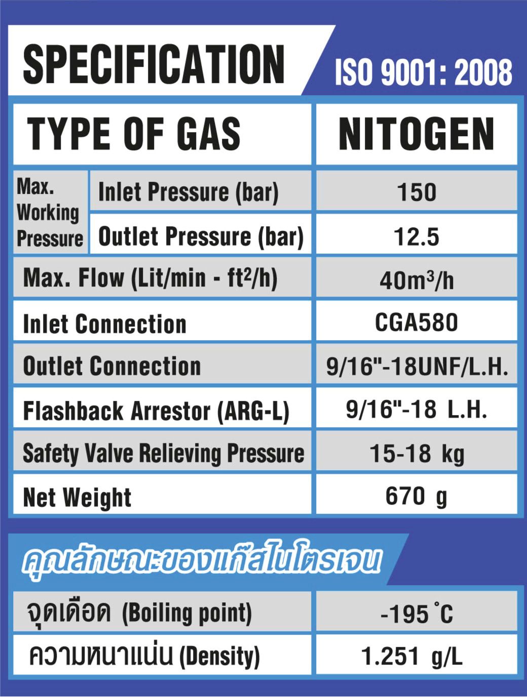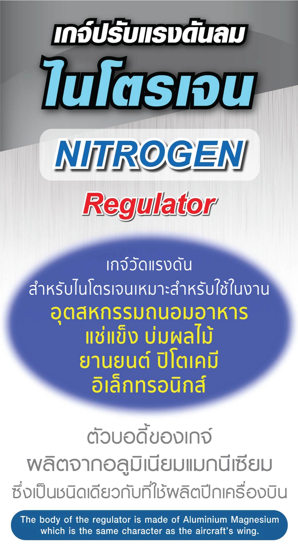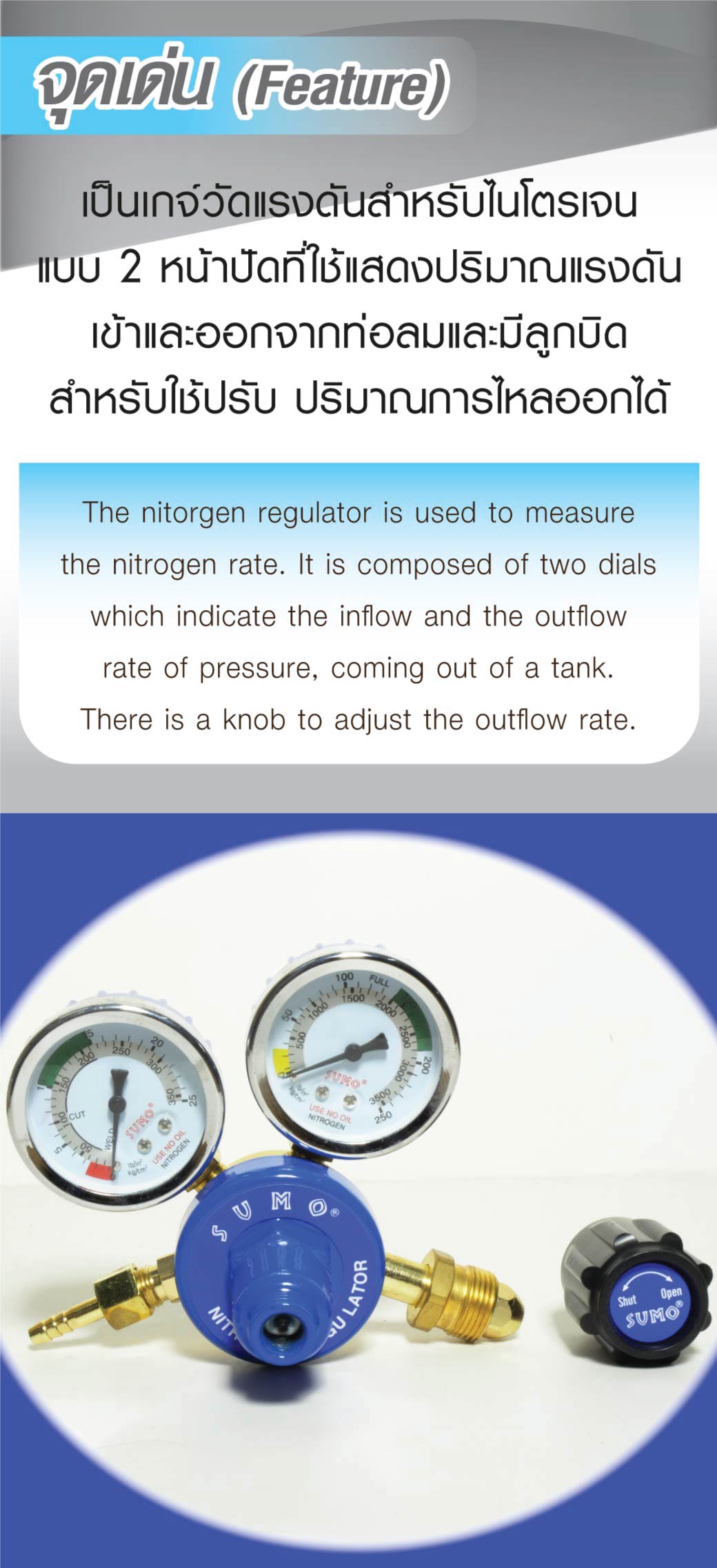 • เป็นเกจ์วัดแรงดันสำหรับไนโตรเจน แบบ 2 หน้าปัด ที่ใช้แสดงปริมาณแรงดันเข้าและออกจากท่อลมและมีลูกบิดสำหรับใช้ปรับปริมาณการไหลออกได้