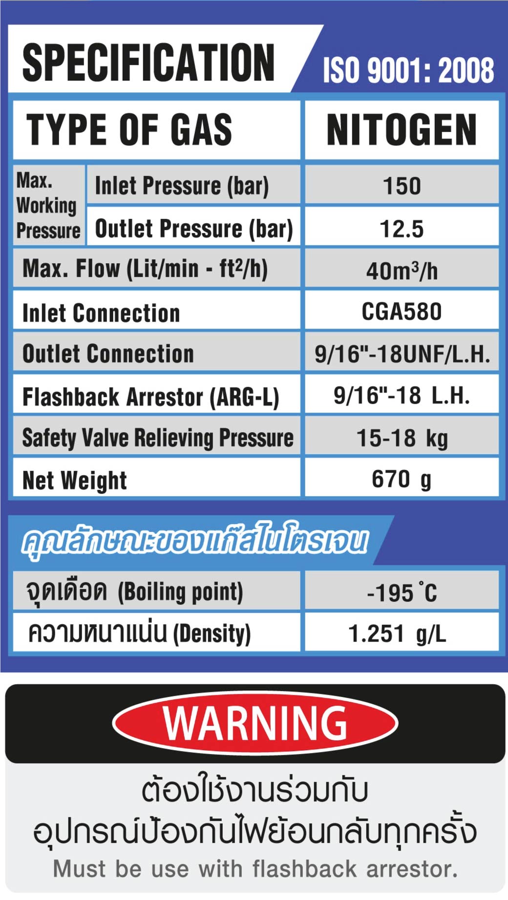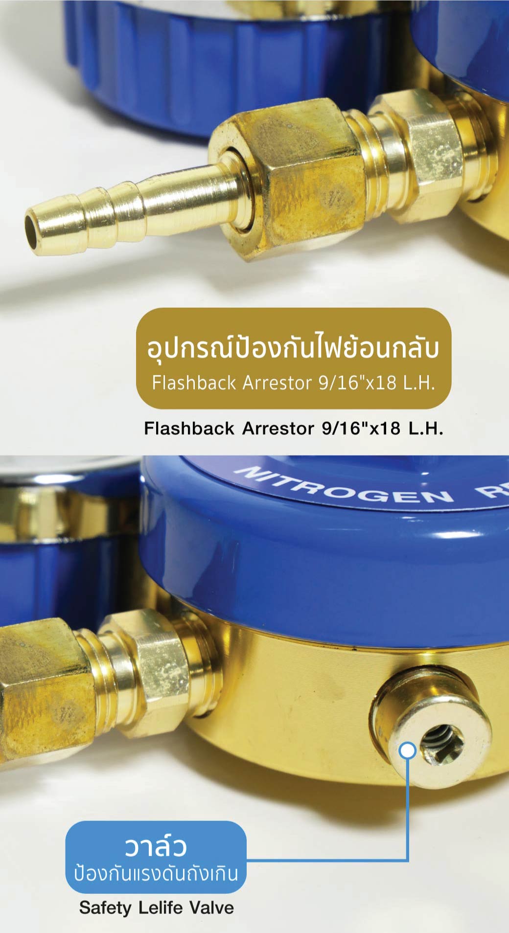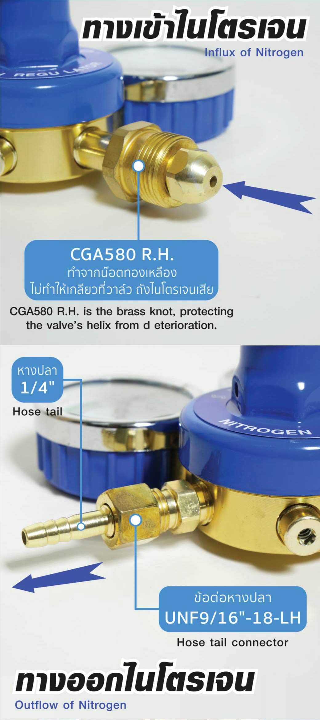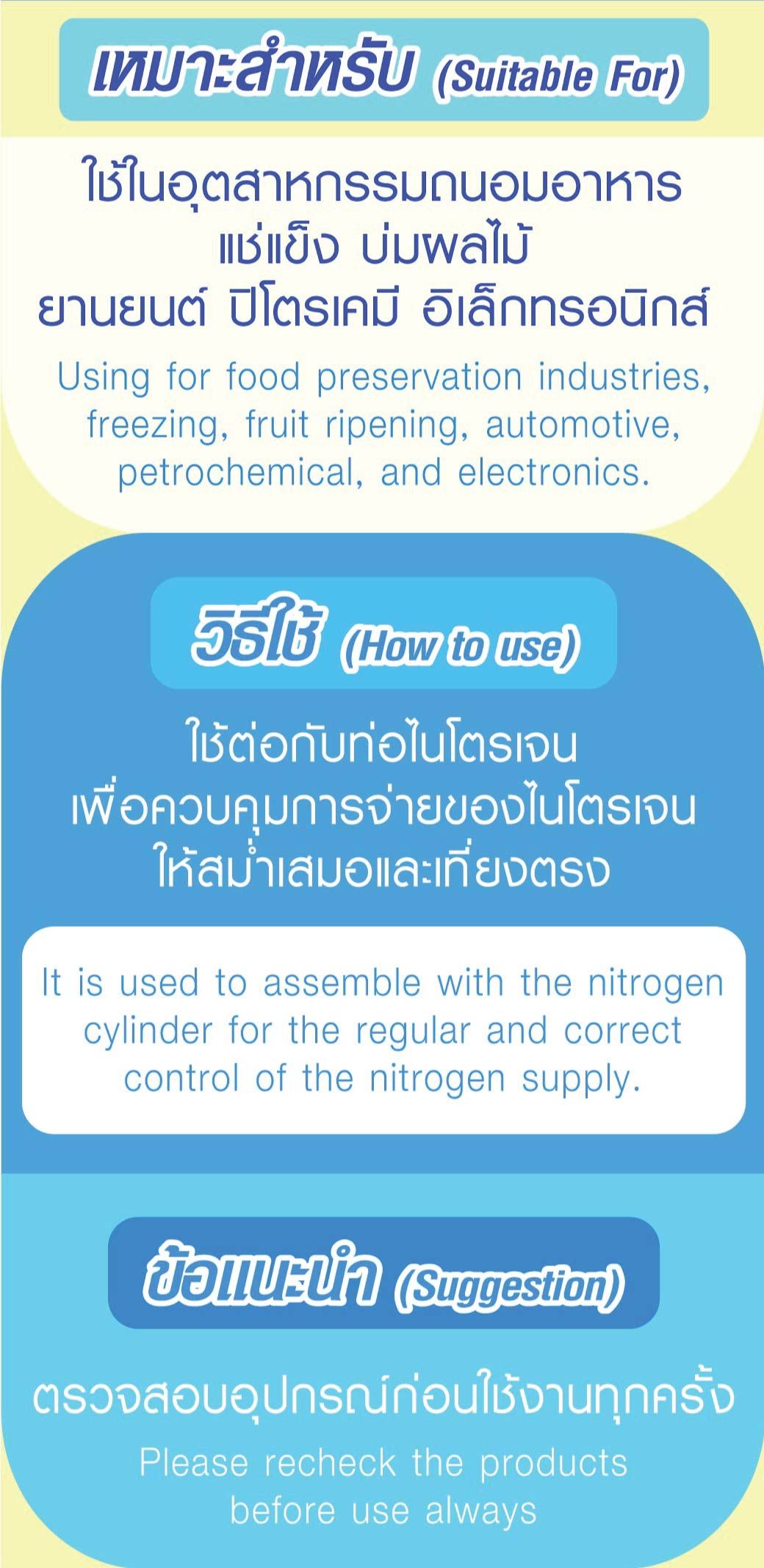 • ใช้ต่อกับท่อไนโตรเจน เพื่อควบคุมการจ่ายของไนโตรเจนให้สม่ำเสมอและเที่ยงตรง