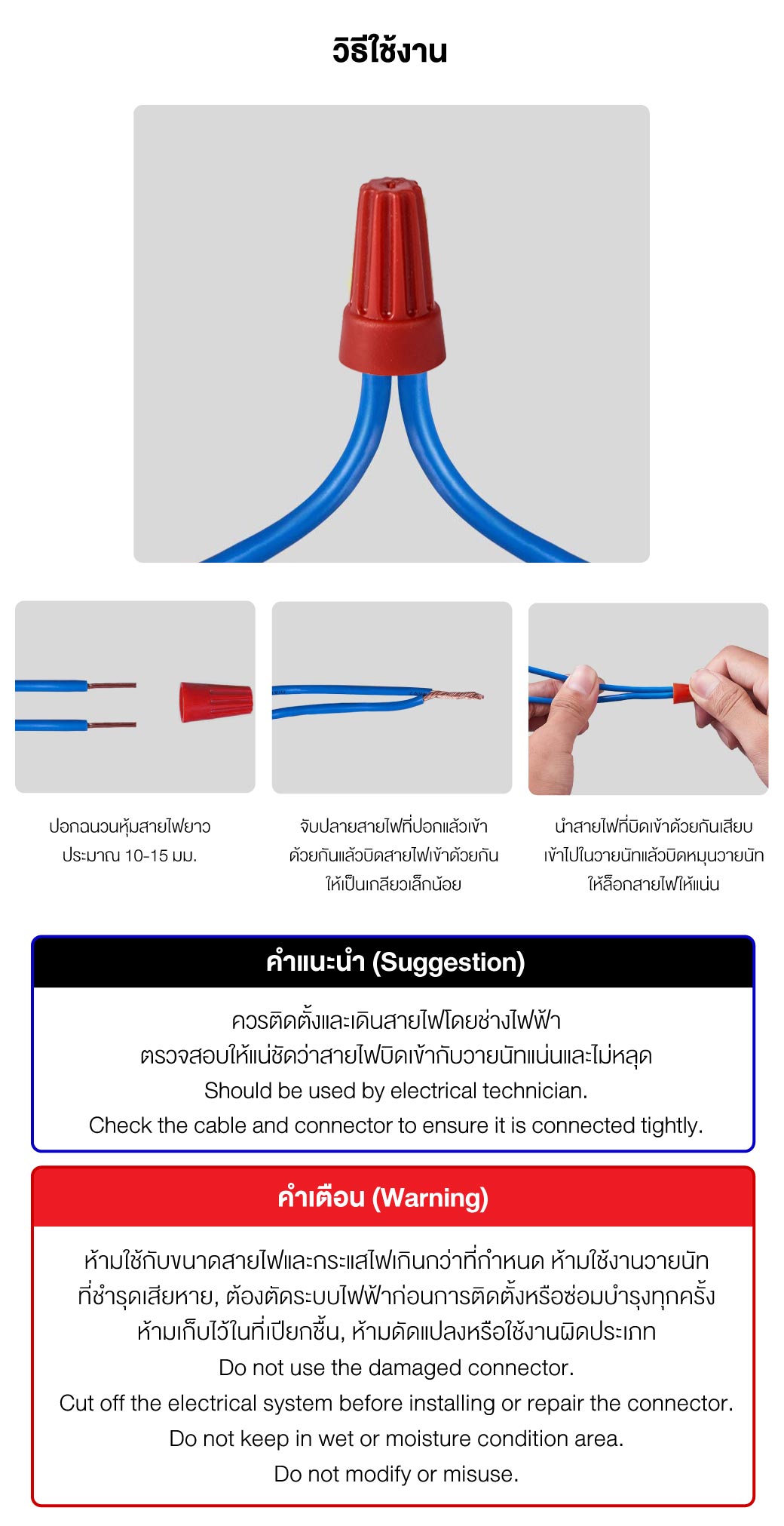 • ตรวจสอบให้แน่ชัดว่าสายไฟบิดเข้ากับวายนัทแน่นและไม่หลุด