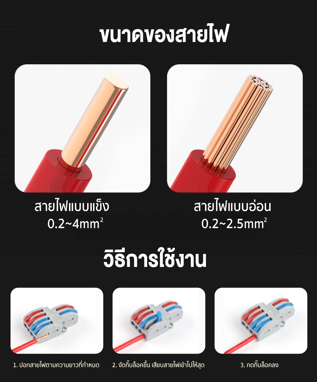 - สายไฟแข็ง (Solid wire) : 0.5-4mm²